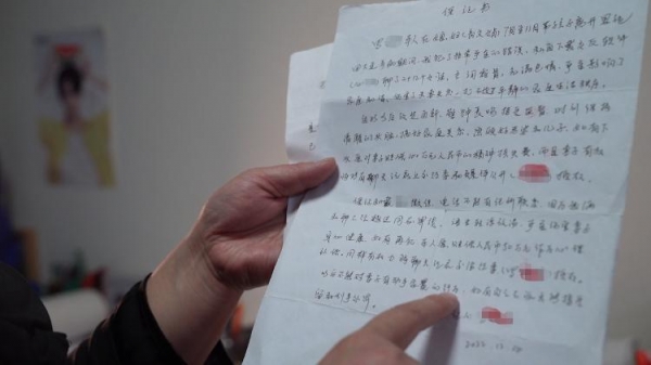 商文娟向记者展示此前丈夫家暴她后写下的保证书。