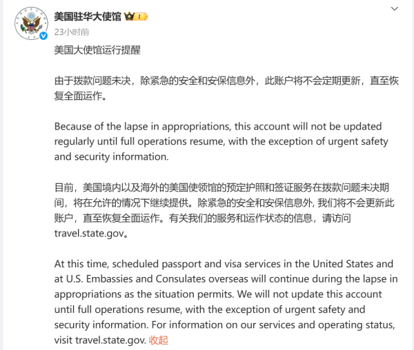 相关公告称,目前,美国境内以及海外的美国使领馆的预定护照和签证服务在拨款问题未决期间,将在允许的情况下继续提供。除紧急的安全和安保信息外,美国驻华使领馆账号将不会更新,直至恢复全面运作。