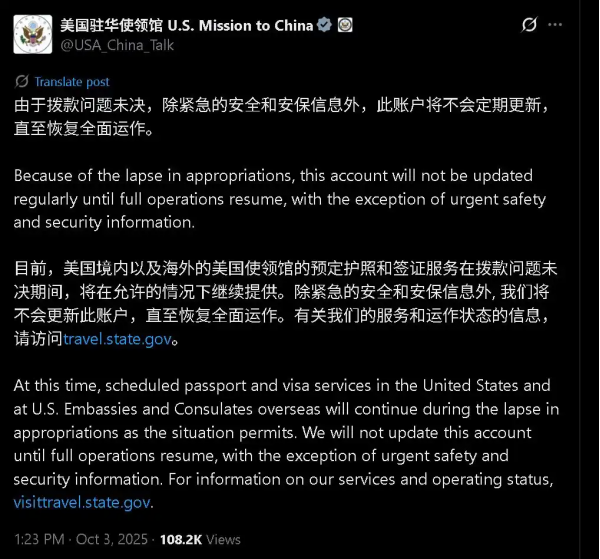 此前,美国驻华使馆已于10月3日宣布停止更新其在社交平台X上的账号。