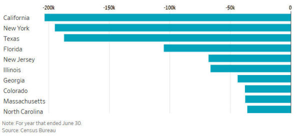 一些大州人口降幅最明显。其中,人口最多的加利福尼亚州出现轻微人口减少。据估算,近年来,加州一直向外州净输出人口,流出远多于流入。