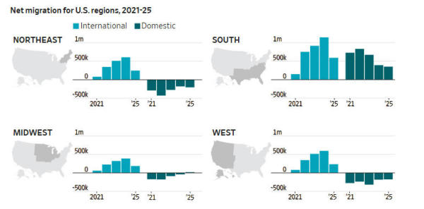 报道称,总体来看,美国2025年人口增长放缓主要由移民政策收紧驱动,而国内流动格局出现微妙变化:南方继续领跑,中西部开始止跌回升,传统热门州如加州、佛州面临压力。