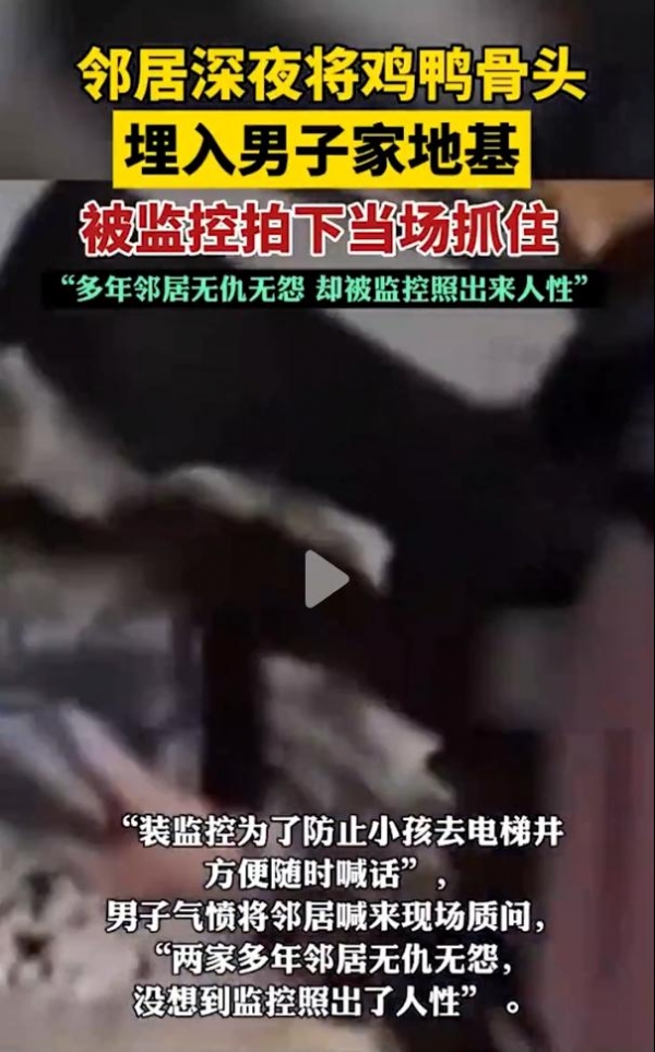 12月13日,一则邻居深夜在男子家地基埋鸡鸭骨头被监控拍下的当场抓住的新闻登上新闻热搜,据新闻中报道,邻居和男子家多年无仇无怨。虽然新闻中没有提到在地基埋鸡鸭骨头有什么寓意,但是从网友的评论来看,或许与一些民间迷信有关。