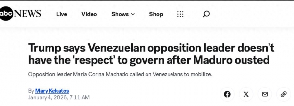 根据多家美国媒体的报道,特朗普在周六关于"抓捕"马杜罗的记者会上表示,马查多在委内瑞拉国内缺乏支持,无法担任委内瑞拉的领导人。