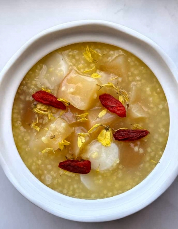 一把小米,一段铁棍山药,半个带皮苹果,三样寻常物丢进砂锅小火慢熬。山药健脾的功力自不必说,小米表层的米油那是养胃的精华,苹果皮千万别削,收敛润肺全指望它。二十多分钟熬出一锅黏稠亮眼的粥,早晨喝一碗,胃里暖烘烘的,一天都有精气神。