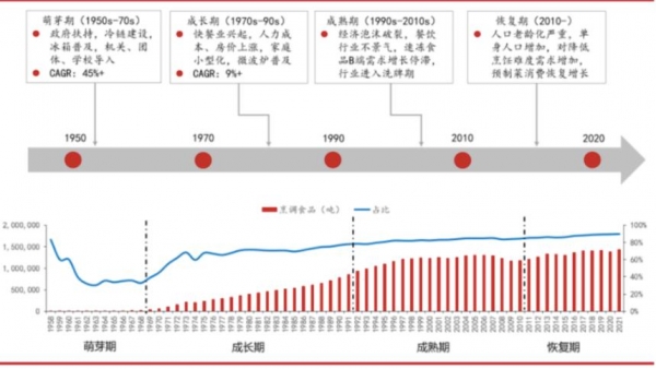 日本冷冻食品的演进就非常有代表性:从1950-1974年的萌芽期,到1974-1997年的成长期,再到1998年以来的成熟期。