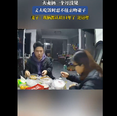 11月16日,江苏,一对夫妻俩一个月没见了,再次见面吃饭时丈夫忍不住亲吻妻子,丈夫高兴极了。