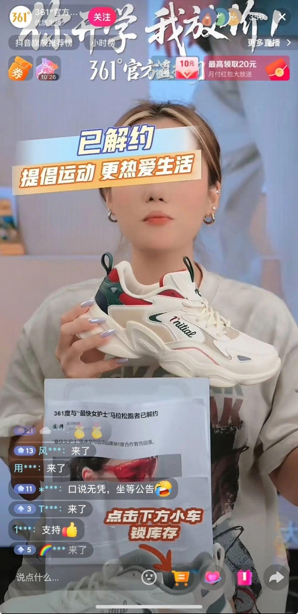 舆论发酵到现在,发现她签约的体育品牌361°,已经和她解约了。361°官方品牌直播间,主持人前边放着一张纸,上面写着:"361°与'最快女护士'马拉松跑者已解约!这几个大字似乎就在平息网友的怒火,如果不解约,该品牌的鞋子卖不出去啊,多么的现实。
