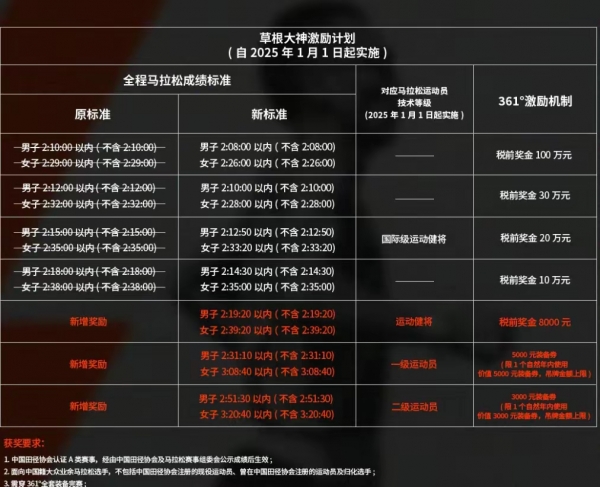 她不是签约了361品牌吗,按照这个品牌的规则,她或许能拿到8000块。361°更新了2025年奖励计划,对于草根大神的激励机制,看到这个表,我们会发现女子只要跑进2:39:20以内,就可以拿到税前8000元的奖金,而张水华的成绩刚好是达标的。虽然张被解约了,但企业信守承诺的话,她或许还是有钱可以拿。