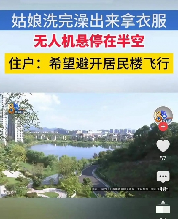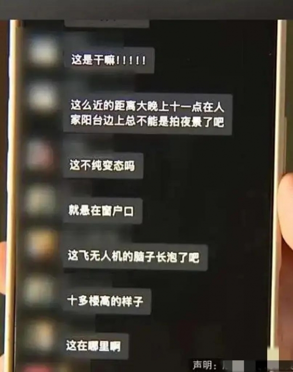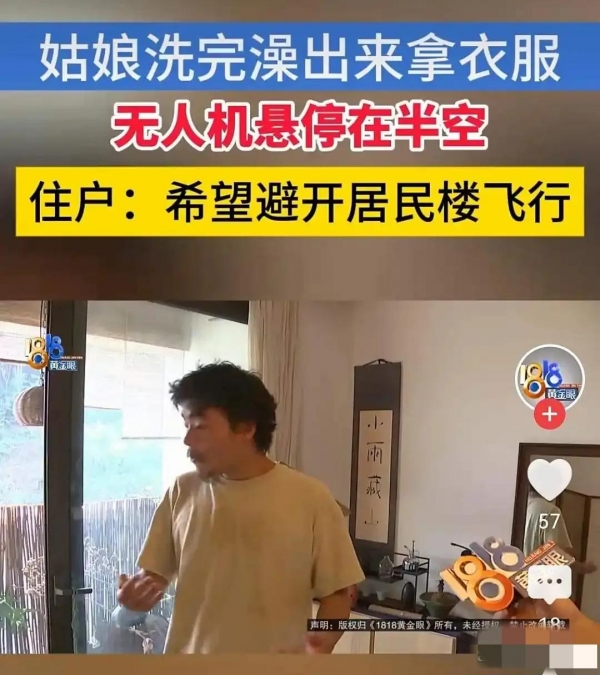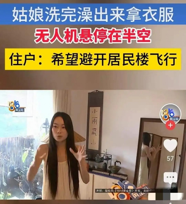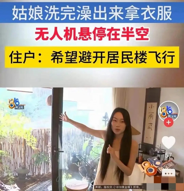 黄女士刚洗完澡,赤着身子走到阳台透气,一抬头,看见窗外停着一架无人机,镜头正对着客厅中间,她一下就慌了,赶紧喊男友下楼去找,等他们跑下去,那无人机早就不知道飞哪儿去了,她没拍着照片,也没录下视频,只能干站着干着急。