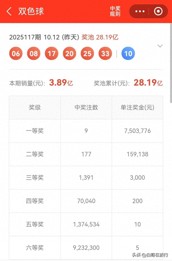 昨晚,福彩双色球第25117期开奖结果揭晓,红球号码为06、08、17、20、25、33,蓝球号码为10。