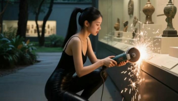 在地质矿物展厅前,她掏出角磨机,对着两扇钢制安全门一顿猛切。
