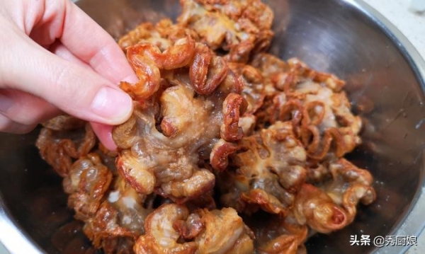 熬猪油,首选猪板油,特别是猪背部的板油,结实平整,熬好的猪油,澄清醇香,猪油渣也更酥脆。其次,选择猪水油、五花肉或猪肚子上的肥肉。因为现在很少有人熬猪油,超市里也没有人买猪板油。我原打算花150块钱买5斤肥一些的五花肉熬油,老板说我太奢侈了,推荐让我买猪水油,5块钱一斤,㸆出来的猪油渣,不管是炖萝卜、炖白菜,都特别好吃!我买了一份20斤装的。拿回家后,先用玉米面,好一顿搓洗,将猪水油搓洗干净,然后,沥干水分备用。