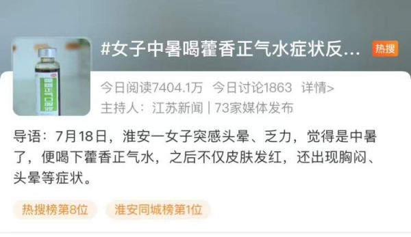 7月19日,#女子中暑喝藿香正气水症状反加重#登上微博热搜,引发网友讨论。