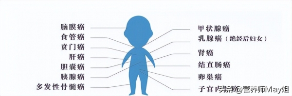 与肥胖密切相关的癌症包括:子宫内膜癌、绝经后乳腺癌、结直肠癌、肾癌、肝癌、胰腺癌、胆囊癌、食管癌、甲状腺癌、卵巢癌、多发性骨髓瘤。
