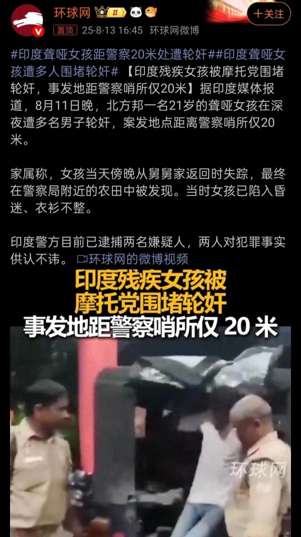 此次案件施暴者专挑聋哑女孩下手,把生理缺陷转化为犯罪便利。正如喀拉拉邦达利特少女案所示:低种姓+残疾=双重沉默靶心 - 。当受害者无法呼救,加害者连消音器都省了,直接开启"静音模式施暴"。在印度,残疾不是需要扶助的标记,而是暴徒眼中的"易撕包装"。