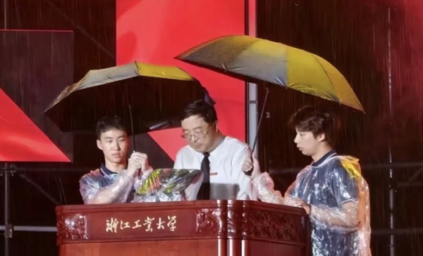 从图片看,浙工大校长高翔在台上发言;由于雨大他身上的白衬衫都已经完全湿透,但是他坚持对台下的新生做演讲,两名同学一人一边帮校长打伞遮雨!