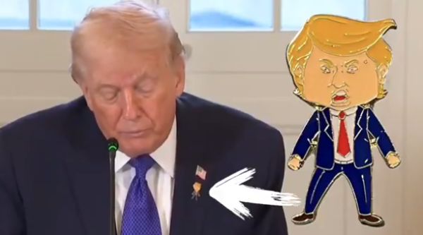 会议期间,特朗普的西装翻领上还别着一枚印有他卡通形象的徽章。