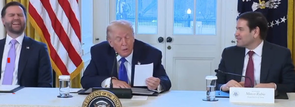 这时,坐在一旁的"递条专业户"国务卿鲁比奥,不知在一张纸上写了什么,随后不动声色地悄悄递给了正眉飞色舞绘制宏伟蓝图的特朗普。一如当初他递纸条提醒特朗普"加沙停火协议达成"那般。