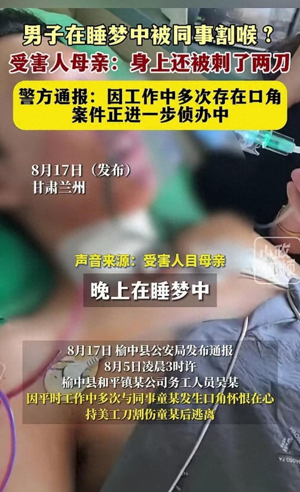 近日网上传播了一则男子睡梦惨遭割喉事件,事后受害男子的母亲证实了此事!