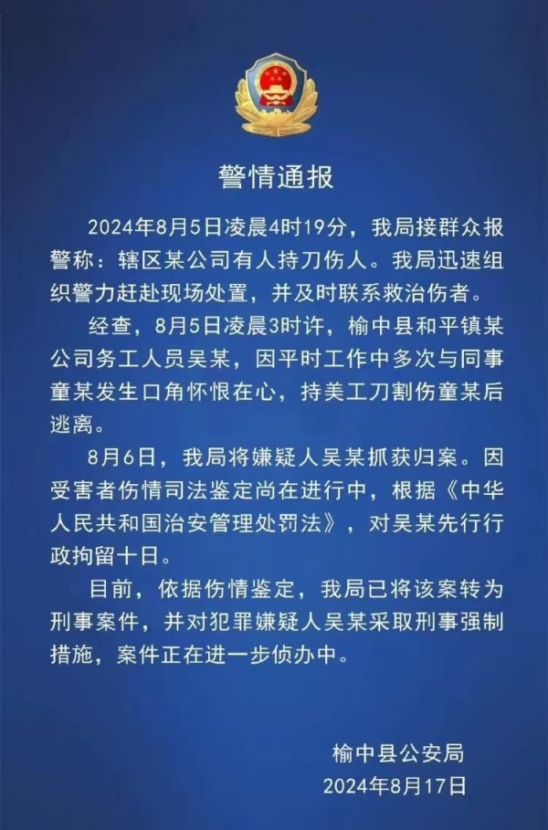 8月17日当地公安对于此事件发出通报,通报中写到受害人童某和犯罪嫌疑人同是一家公司的务工人员,因平时工作吴某和童某多次在公司发生争执,因此吴某怀恨在心,事发当晚吴某持美工刀悄悄潜入童某房间作案!