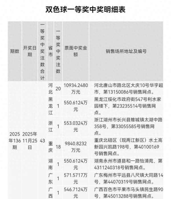上期是25136期,开奖号码是8、10、14、23、28、32+12,一等奖井喷43注,中奖城市是河北20注,重庆18注,黑龙江、浙江、湖南、广东、广西各1注。以下是中奖网点,有兴趣的朋友可以看下。值得一提的是,本期河北20注和重庆18注,都是出自一个网点,应该都是一人中的,太幸运了!