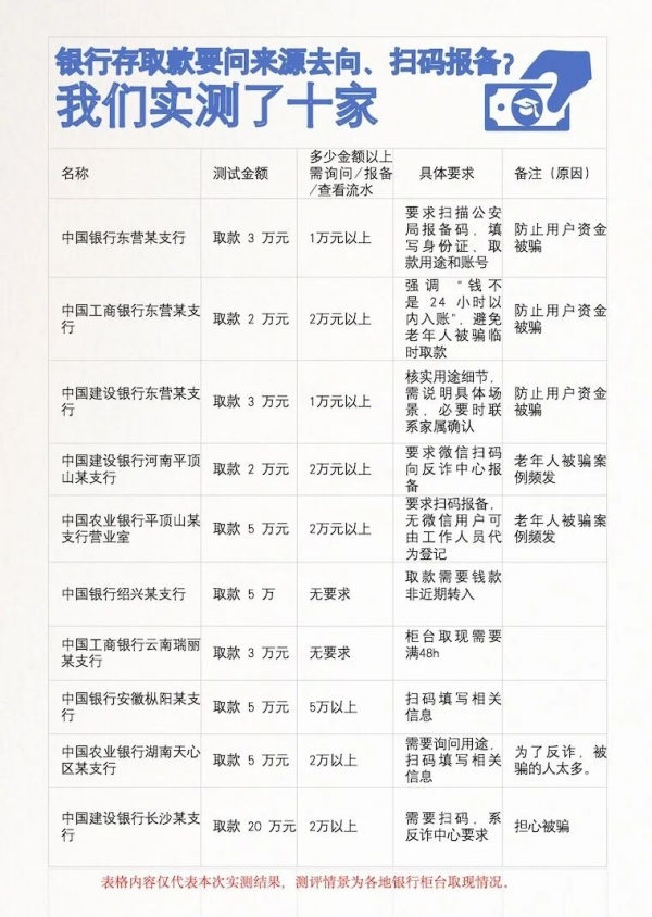 实测十家银行,我们发现多个银行在取款一定数额时有相应的报备要求。