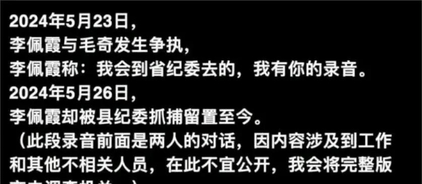 李佩霞的父亲李长柳在举报中提到,李佩霞在5月23日与毛奇发生了争执,这一争执让李佩霞罕见地对自己的上司发脾气,甚至威胁要去省纪委举报他,并且声称手中有录音证据。李长柳之所以知道这些细节,是因为女儿李佩霞在4月28日留下了一封信和一个U盘。信中,李佩霞告诉父亲,如果她遭遇不测,必须异地网上实名举报,而这个U盘中的内容是她的"保命符"。