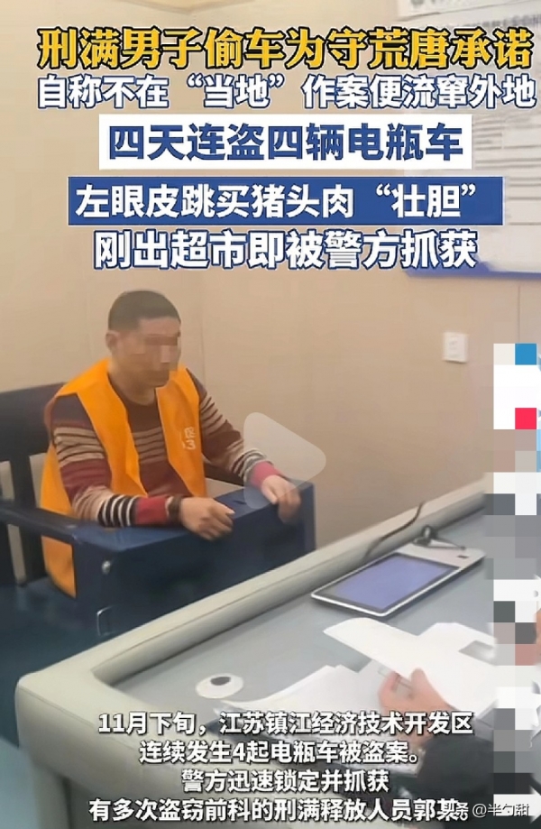 江苏一郭姓男子偷车被抓,民警一看,这不老熟人了,上个月刚被放出来,如今又重操旧业,这不就是放了个假而已。