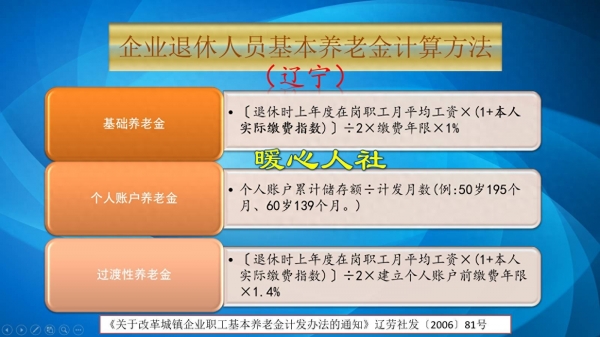 退休时的养老金计算一般使用全省统一的计算公式。但是不同的地方也会有一定的差异。比如说辽宁省的养老金计算公式是这样的: