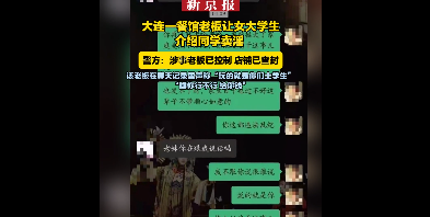 8月2日,有网友称辽宁大连一餐馆老板给女大学生发信息称,希望女生介绍同学卖淫,该老板在聊天记录里声称:玩的就是你们土学生,睡你行不行,给你钱!目前涉事老板已被警方控制,店铺已被查封,该案件警方仍在调查处理中,该事件在网络上引起了广泛的关注与讨论!