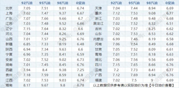 今日最新油价(2025年10月25日)92号,95号,98号汽油,0号柴油最新油价列表如下