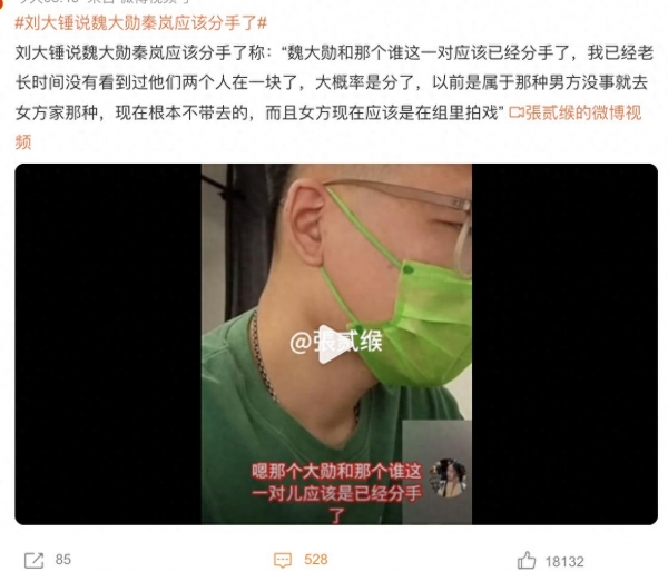 刘大锤在直播中爆料,秦岚和魏大勋已经分手,两人已经许久没在一起了。