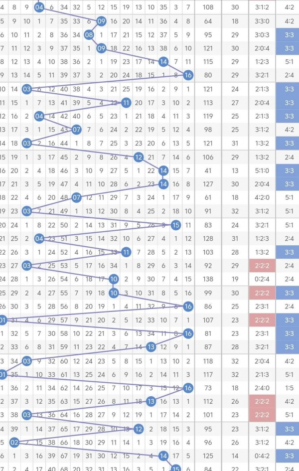 24142期,或许我们可以继续关注冷号和重号的重复现象。特别是01、03、06、07、09这些号码,看似冷清,但结合历史数据,它们有时会以"冷转热"的方式意外出现。蓝球方面,04、09、10的热度可能会让你刮目相看。