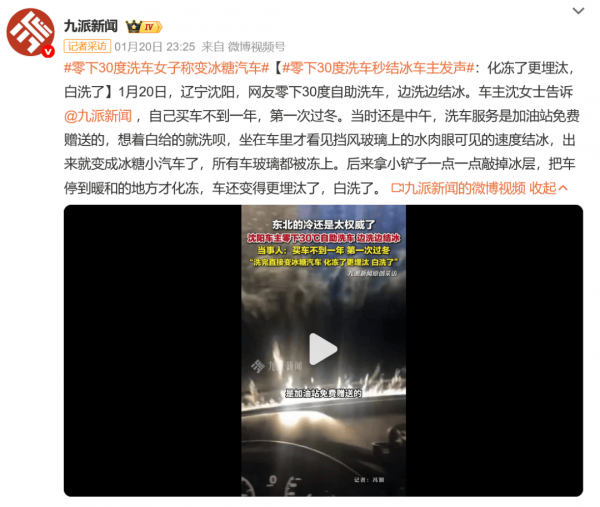 近日,辽宁沈阳的网友零下30度自助洗车,边洗边结冰。车主沈女士称自己买车不到一年,第一次过冬。