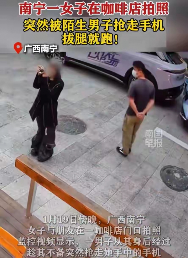 前几天广西南宁发生了件事。1月19号傍晚,有个女的在咖啡店门口和朋友拍照。突然有个陌生男的从后面走过来,等走到她身后时脚步明显慢下来。趁她专注摆姿势时一把抢过手机就跑。那女的反应快,立刻追出去。后来那男的跑了一段把手机扔了,女的捡回来后咖啡店工作人员报了警。现在警察还在调查这事,监控视频里看得挺清楚的。