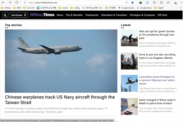 据美联社、美军事时报网站等多家媒体11月27日报道,中国战机在台湾海峡跟踪了美国海军的飞机,美国军事时报网还把这篇转发美联社的报道放到了头条。美国派军机在中国的家门口转悠还指责中国跟踪监视,真是贼喊捉贼、倒打一耙,岂有此理!