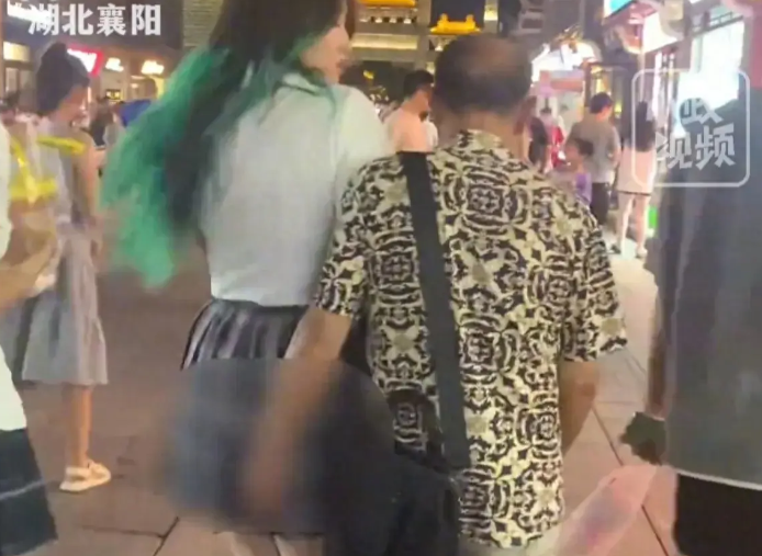 这时一名秃顶老大爷,身穿花色上衣,背着小挎包,在步行街上溜达,但是他专门往人多,穿着性感的美女身边挤!