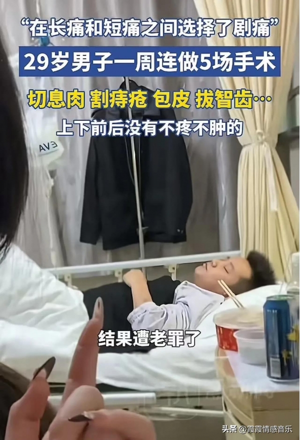 可他万万没想到,理想有多丰满,现实就有多"疼"。术后的痛苦直接翻倍,痔疮术后排便的撕裂痛,包皮术后的牵拉痛,智齿术后张口困难的放射性痛,多重疼痛层层叠加,坐也不是站也不是,躺着都得小心翼翼,吃饭只能喝流食,连喝水都怕牵扯伤口,用他的话说,简直是"生不如死"。