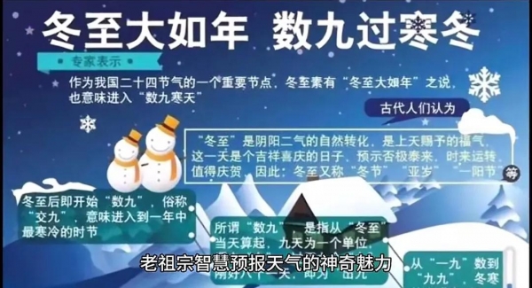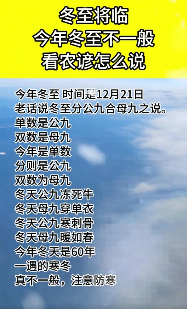 第三个特点,今年冬至"数九"是"公九"。民间说"数九"从冬至开始,要是冬至这天是"单数"日期就是"公九","双数"就是"母九"。今年冬至是 12 月 21 日,显然是"公九"。那句"公九冻死牛,母九穿单衣"一直在耳边回响,感觉今年冬天的寒冷已经在慢慢靠近,随时准备出来。