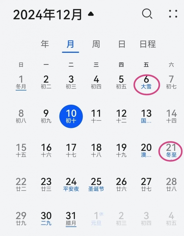 那今年是早冬至还是晚冬至呢?今年冬至是 12 月 21 号,入节时间是 17 点 21 分左右,在 12 点之后,所以是晚冬至。这就预示着今年冬天后面可能会有特别冷的时候。