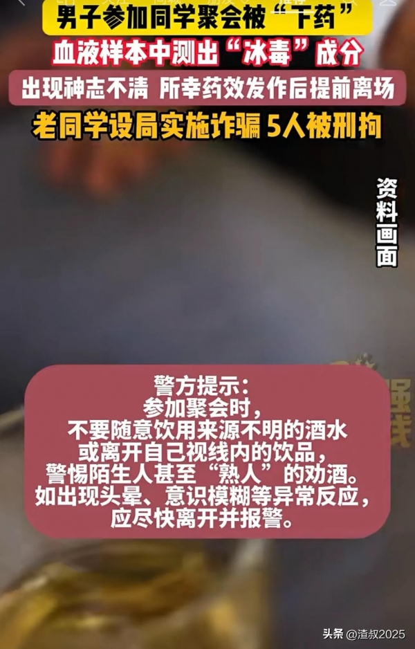 警方提示:参加聚会时,不要随意饮用来源不明的酒水或离开自己视线内的饮员,警惕陌生人甚至 "熟人"的劝酒。如出现头晕、意识模糊等异常反应,应尽快离开并报警。