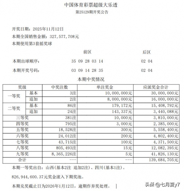2025年11月12日,超级大乐透第25129期开奖。本期全国销售额3.27亿元,开奖号码前区03、09、14、28、35,后区02、04。本期开奖呈现出"跨度大、冷热交织"的特点,山西省成为最大赢家。