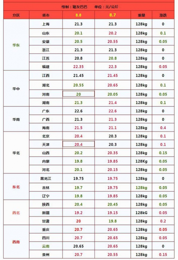 8月8日全国南北各省区生猪价格一览表: