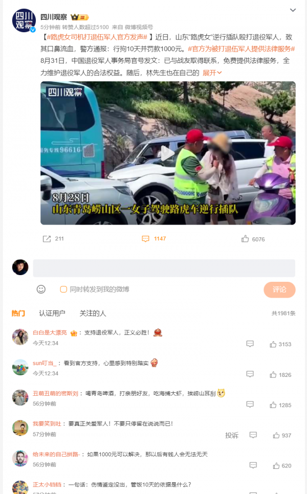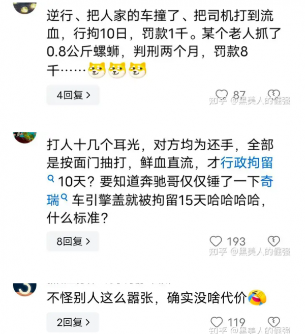 男人完全占理,面对逆行的不法行为没有退让,面对王某多次无礼挑衅辱骂,没有搭理,面对十多次重击而没有还手。对于女司机的处罚,拘留10天,处罚1000元,引发网友热议,觉得处罚过轻,无法起到惩戒与警示作用,这点处罚对路虎女来说连皮毛都没伤到,违法成本太低了。"不怪别人嚣张,确实没啥代价",有网友表示。