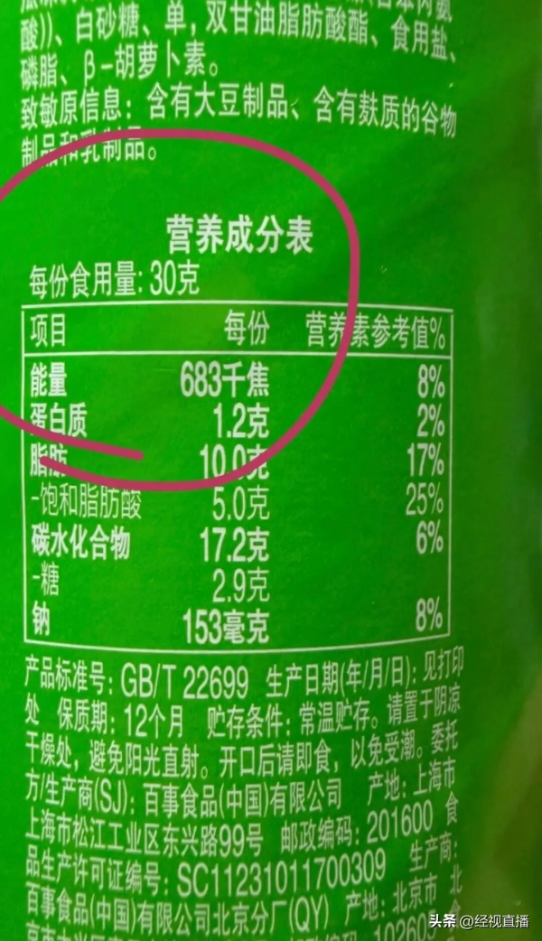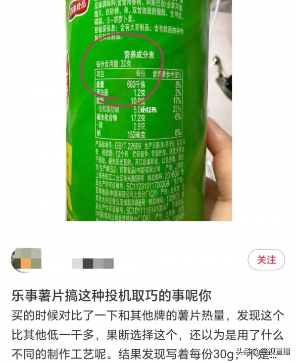 该网友表示,这意味着整盒薯片被分为3份,实际热量高达2049千焦,若按通用的"每100克"计算,其热量应为2276千焦。评论区中,有部分网友认为企业利用计量单位"拆分"热量,存在营销误导。