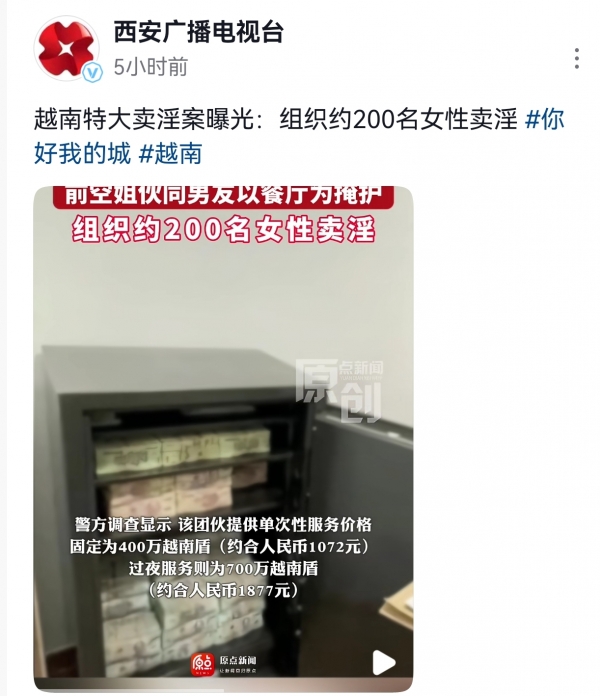 根据警方调查显示,该团伙提供单次服务,价格固定为400万越南盾,折合人民币约为1072元。