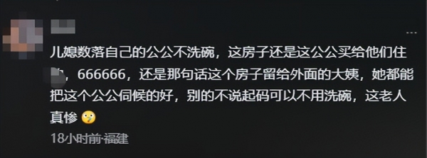 儿媳数落自己的公公不洗碗,这房子还是这公公买给他们住的,666666,还是那句话这个房子留给外面的大姨,她都能把这个公公伺候的好,别的不说起码可以不用洗碗,这老人真惨