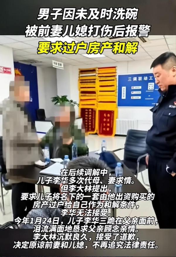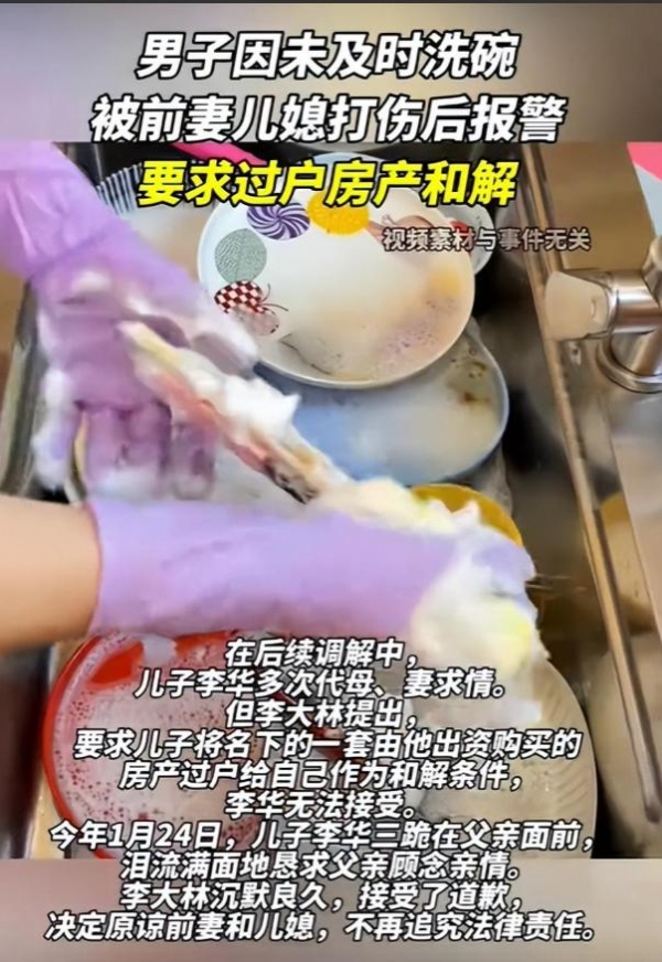 说起来也挺可笑,本来就是因为俩人过日子的习惯不一样,一个觉得该及时洗碗,一个觉得晚点儿无所谓,闹起来的一场小别扭,谁也没想到,最后居然闹得越来越大,不光是打架、报警,还扯到了房子怎么分的事儿上,俩人吵着要谈房产分割,互不相让,僵持了好久。一直闹到他俩的儿子李华过来,看着爸妈和媳妇闹得这么凶,实在没办法,就三次跪下求他们,让他们别再闹了,看在孩子的面子上各退一步,这事儿才算勉强平息下来,没再继续闹大。