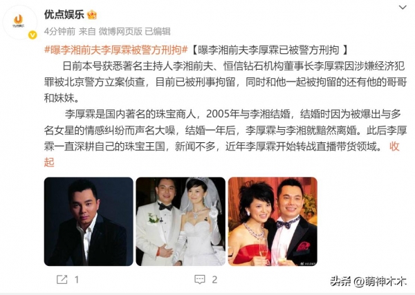 娱乐圈又曝瓜了!12月18日,有娱乐博主爆料,李湘的前夫、恒信钻石机构董事长李厚霖因涉嫌经济犯罪被北京警方立案侦查,目前已被刑事拘留,同时和他一起被拘留的还有他的哥哥和妹妹。
