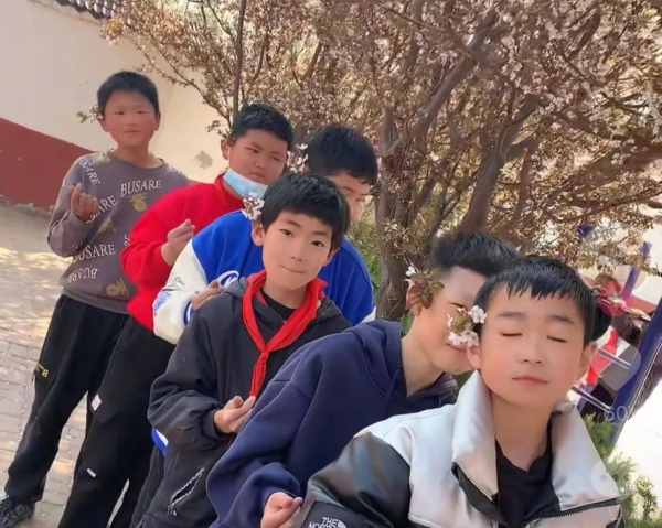 苏老师的第一个视频记录了体育课上,带着孩子们看春天的樱花。孩子们调皮地把樱花戴在耳后,脸上的笑容藏都藏不住。